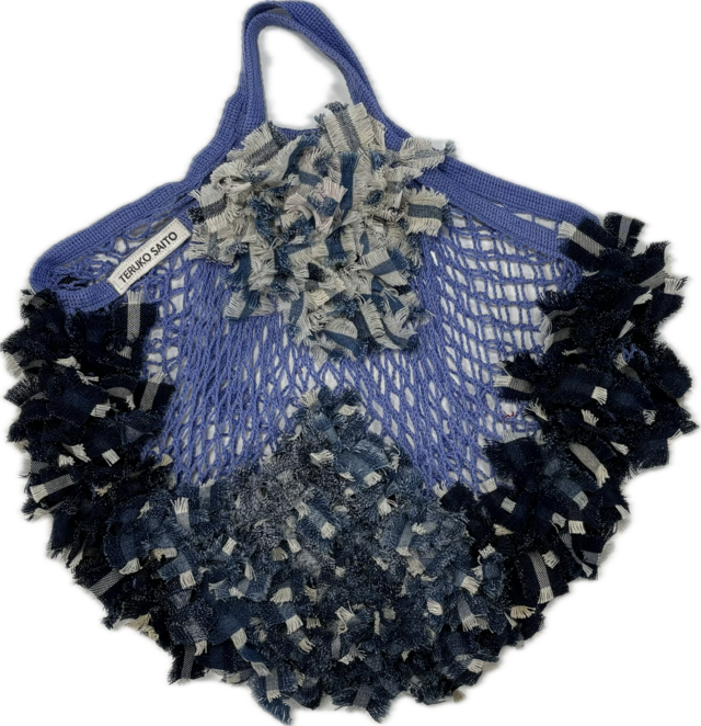 ネットバッグのボディにデッドストックのヴィンテージデニムを 一つ一つリボンとして付けたバッグです。